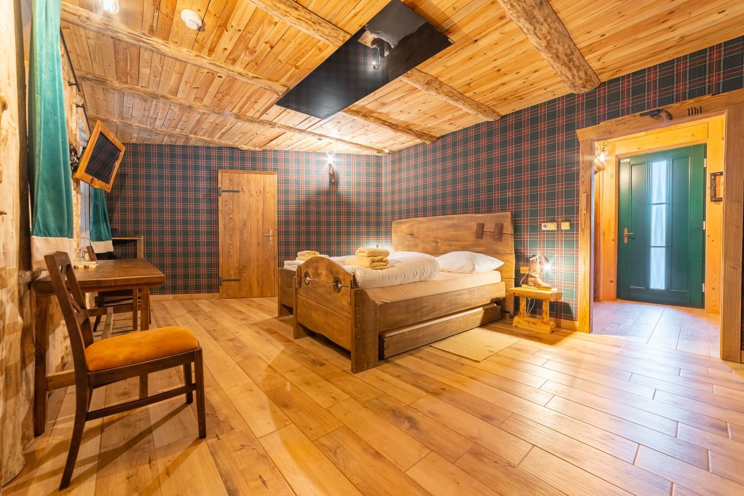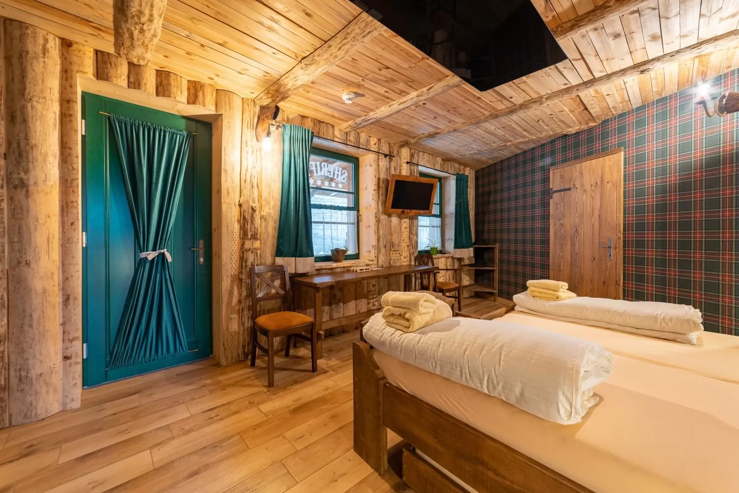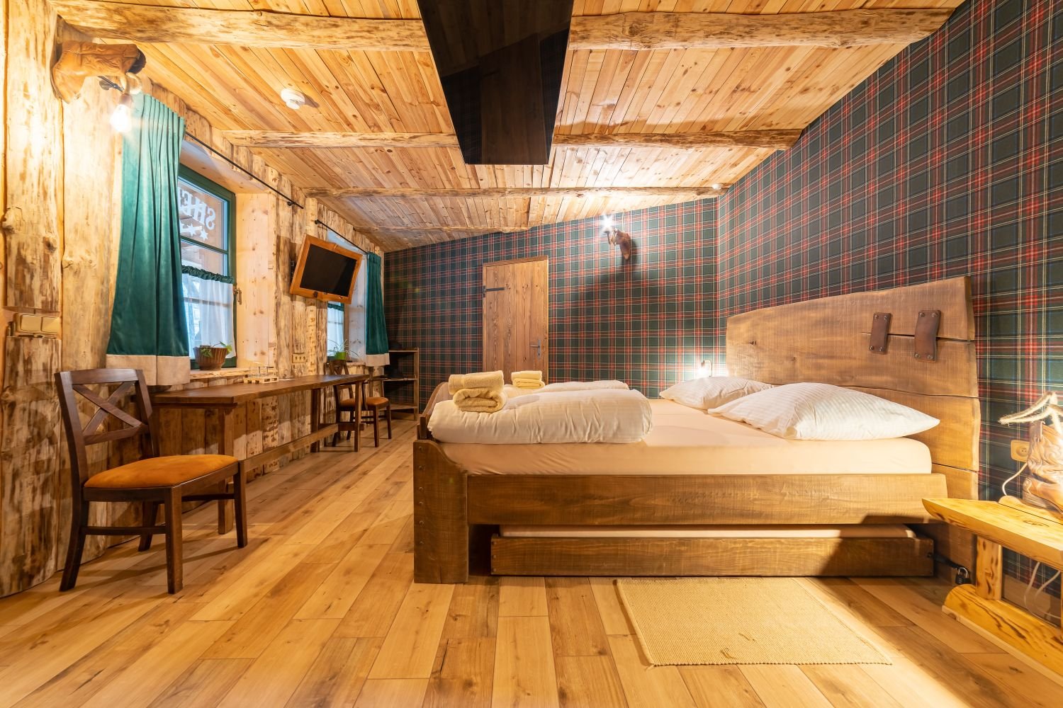 Táto dvojlôžková izba, nazývaná Room Scheriff R13, sa nachádza na prízemí a je možné do nej pridať výsuvnú prístelku, čo poskytuje väčší komfort a flexibilitu pre našich hostí.